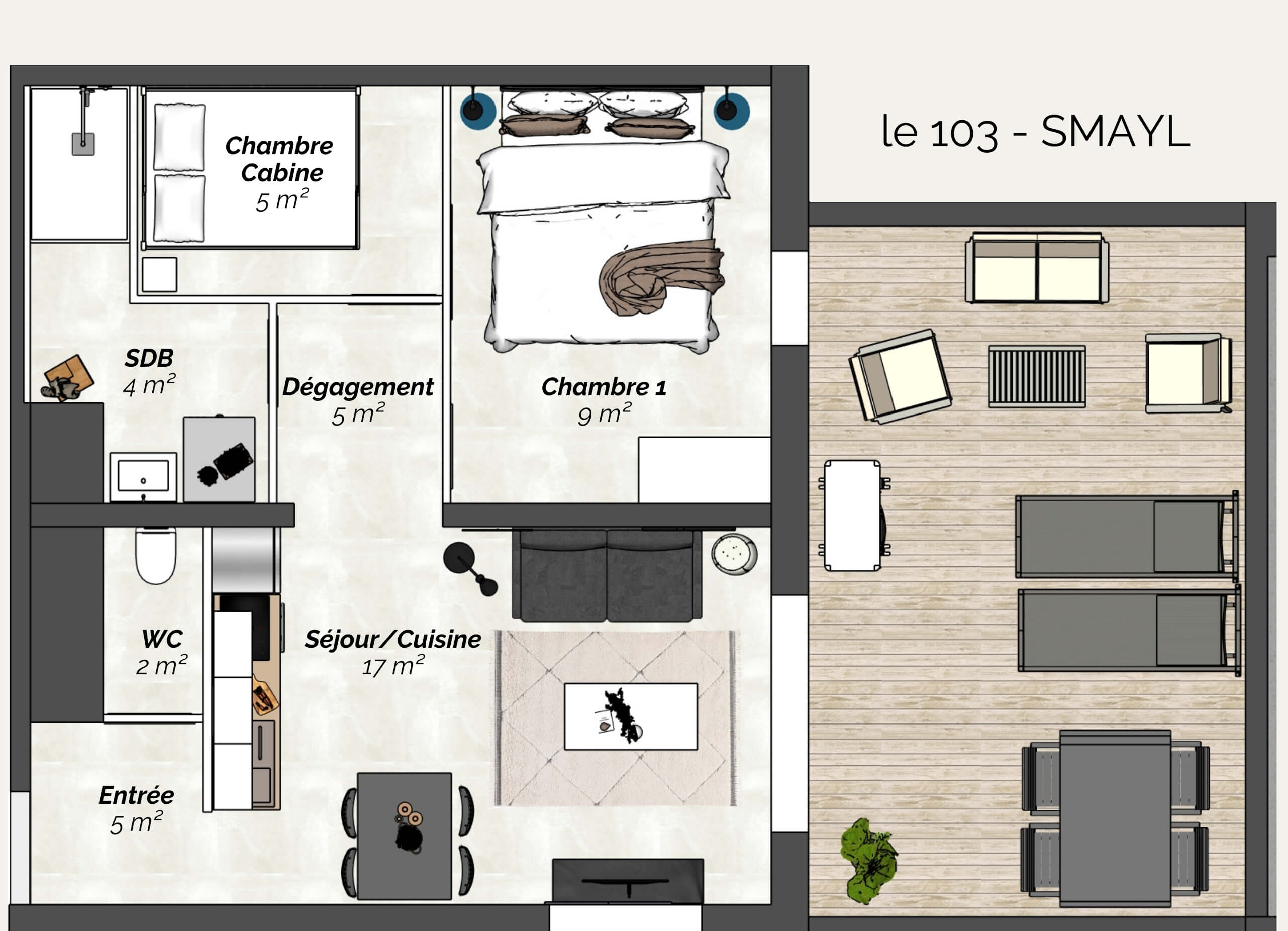 Cet appartement offre un salon lumineux avec cuisine équipée donnant sur une terrasse idéale pour vos repas en plein air. Une chambre parentale avec rangements, une chambre cabine cosy, et une salle d’eau avec douche pour un confort optimal.