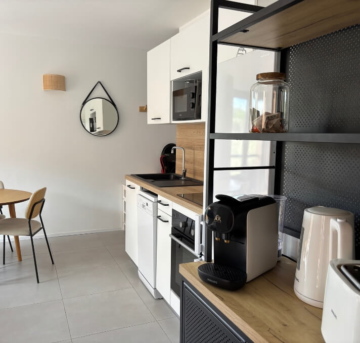 – Cuisine aménagée et équipée ( bouilloire, grille-pain , machine à café…)