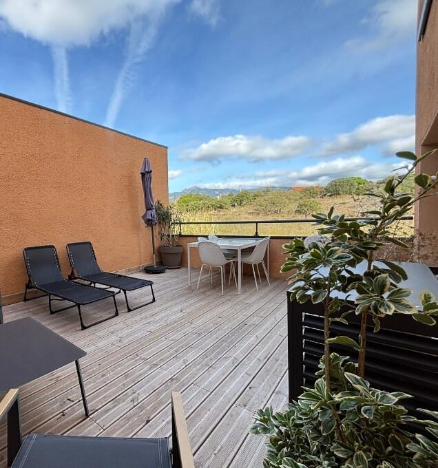 Vue dégagée vers le ciel et à l’Est, maquis et montagne en face, vous pourrez vous reposer sur les 2 transats à disposition, prendre l’apéro et déjeuner en terrasse, sans vis à vis. Et même arroser nos arbustes et fleurs qui égaillent la terrasse !