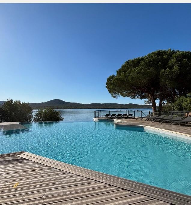 Notre résidence hôtelière au sein de Cala di Pianottuli a les pieds dans l’eau, plage intégrée à 80 mètres, avec une piscine chauffée à débordement avec une vue sur la mer et le spectacle des bateaux quittant le port.