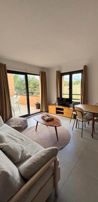 Vivez un séjour tout confort en Corse du Sud, appartement T3 de 50m², exposé Est, avec 2 chambres et une grande terrasse ombragée. Venez jusqu’à 4 personnes grâce à ses 2 chambres pour passer un séjour ensoleillé et reposant.
