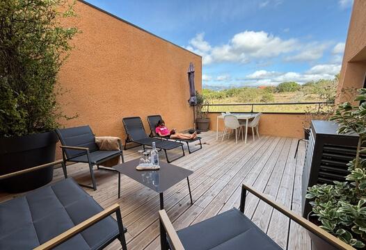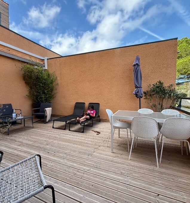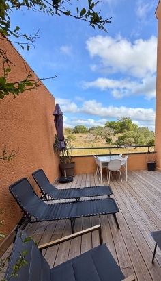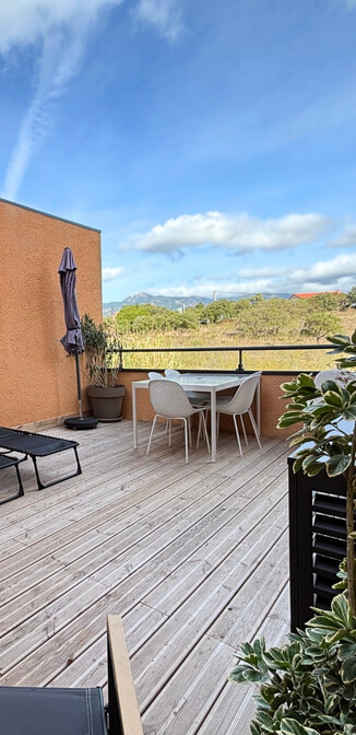 Vue dégagée vers le ciel et à l’Est, maquis et montagne en face, vous pourrez vous reposer sur les 2 transats à disposition, prendre l’apéro et déjeuner en terrasse, sans vis à vis. Et même arroser nos arbustes et fleurs qui égaillent la terrasse !
