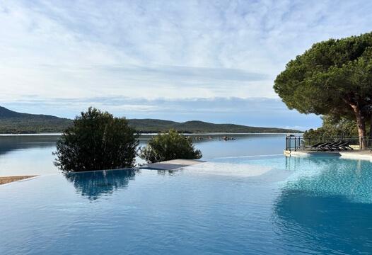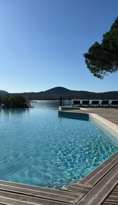 Notre résidence hôtelière au sein de Cala di Pianottuli a les pieds dans l’eau, plage intégrée à 80 mètres, avec une piscine chauffée à débordement avec une vue sur la mer et le spectacle des bateaux quittant le port.